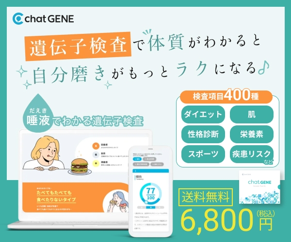 まとめ「chatGENE」は、株式会社KEAN Healthが提供する、価格6,800円という手頃さと検査項目数400種という充実さを備えた遺伝子検査サービスです。